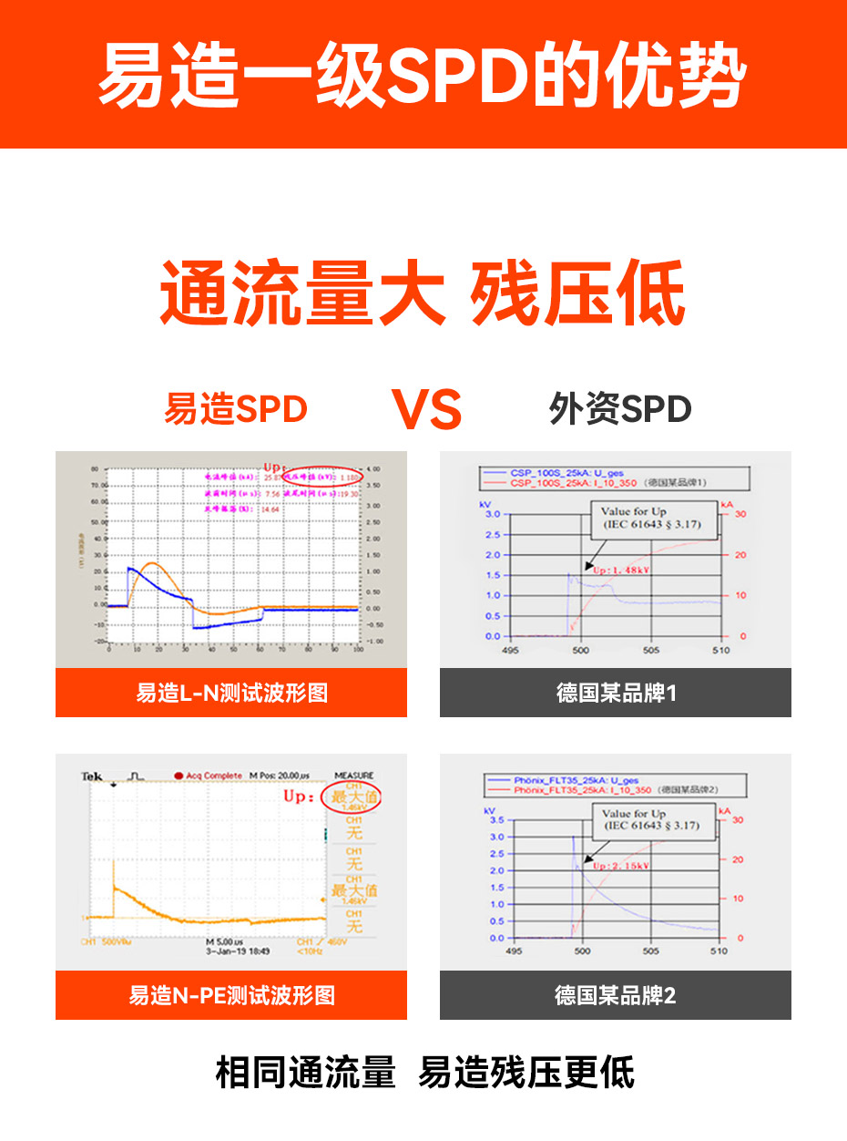 易造T1級浪涌保護(hù)器采用MG復(fù)合型技術(shù),無續(xù)流無漏電流,有效解決了傳統(tǒng)SPD易斷電易老化的短板缺陷,可長期耐受諧波過電壓,使供電系統(tǒng)更加穩(wěn)定。小型化設(shè)計(jì)每相寬度僅一個(gè)模數(shù)(18mm)使配電箱空間更充裕。易造T1級SPD采用主回路脫扣裝置,當(dāng)SPD承受過電壓時(shí),即便是小電流也會導(dǎo)致脫扣裝置脫扣,主回路斷開無電流流過避免燃燒,從而避免誤告警。