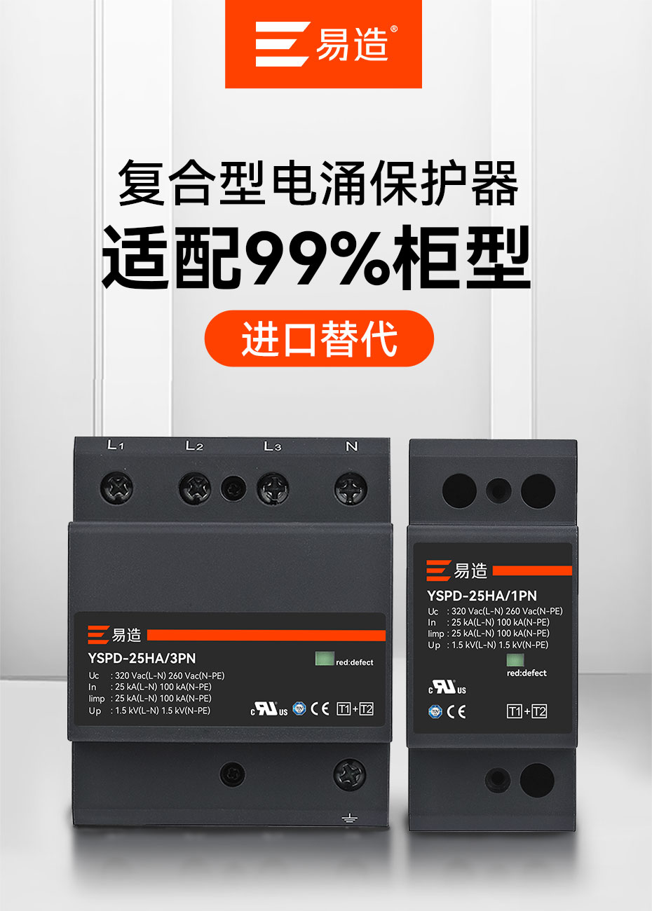 易造YSPD系列一級(jí)、二級(jí)、三級(jí)電涌保護(hù)器將安全和創(chuàng)新出色地融合在一起,采用突破性MG復(fù)合型技術(shù),解決了傳統(tǒng)SPD的短板缺陷,無(wú)續(xù)流無(wú)漏電流,延長(zhǎng)了SPD使用壽命并提高了供電效率;易造SPD小型化設(shè)計(jì),每相寬度僅一個(gè)模數(shù)(18mm),使配電箱的空間更充裕,并具有本地及遠(yuǎn)程告警功能,維護(hù)方便;靈活的鏈?zhǔn)椒烹娂夹g(shù)簡(jiǎn)化了SPD的安裝方式,上下級(jí)SPD能量自動(dòng)配合,無(wú)需退耦器,顯著提升了電涌保護(hù)效率和TOV耐受能力,確保供電系統(tǒng)的穩(wěn)定性。